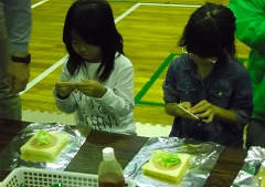テントの片付け終了後、朝食のために班ごとにホットサンドづくりを行いました。ホットサンドづくりでは、特別な調理器具を使わずに、牛乳パックやアルミホイルを使い、洗い物などの片づけが少なくて済む調理方法を体験しました。どの班も、自分の役割をしっかりと果たし、おいしいホットサンドを作ることができました。