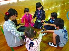 出会いのつどいの後には、お互いのことをよく知り、協力しながら活動を進めていくことができるように、人間関係づくりのレクリエーションを行いました。リズムに合わせて体を動かすゲームなど、レクリエーションを通して初めて出会った友だちと仲良くなることができました。