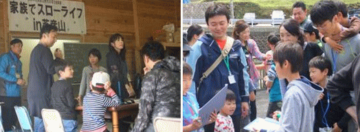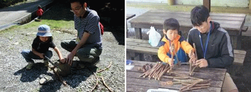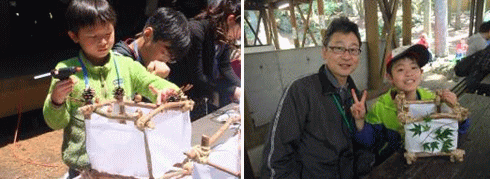 | プログラムの最後に、英彦山の自然の材料を使用して、家族で協力してものづくりに取り組んでもらうために、森のクラフトづくりを行いました。森のクラフトは、今回灯篭づくりを行いました。初めに家族で落ち葉や枝などの材料を集めました。次に、真っ直ぐに伸びた枝を集めのこぎりで切り、最後に輪ゴムや麻ひもで木を組みながら灯篭の形を作っていきました。各家族は、楽しく一生懸命取り組み、思いをこめた作品を完成させていました。「自然の物を使って、こんな作品ができるのかと驚きました。これから自然の中に遊びに行った時には、活動の幅が広がりそうです。」などの感想が聞かれました。 |