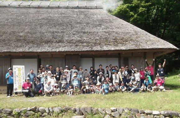 昼食後、家庭でも米づくりを体験していただくためにバケツに稲を植えました。上津野村づくり推進協議会事務局長より「バケツの中に苗をたくさん植えないこと」「水を絶やさないこと」などの説明をしていただき、バケツ稲を植えました。バケツ稲は、家庭に持ち帰って栽培を続けてもらい、秋に行う第2回にもってきてもらうことにしています。その後、参加者は1842年に建築された国指定重要文化財の数(す)山(やま)家を訪ねました。そこで、藁ぶき屋根を守るためのいぶし作業を見学することができ、参加者は、感動していました。