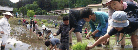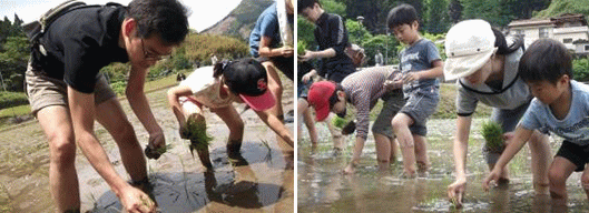 | 参加者は、上津野地区の方々の指導のもと、水田に入り田植えを行いました。3~5本ずつの苗を植えていくことを教わり、真っ直ぐに張られたロープを目印に、横一列に並んで丁寧に植えていきました。初めは、泥の感触に戸惑ったり動けなかったりしていました。しかし、次第に慣れてくるに従って、田植えを楽しむ姿が見られました。田植え指導をしていただいた上津野地区の方々からたくさんほめられた子どもたちは、とても嬉しそうでした。みんなで植えた苗を、秋に収穫する予定です。 |