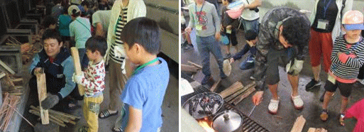 | ↑鉈で薪を割る様子 |