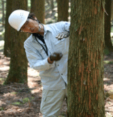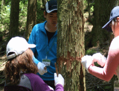 参加者に誰でもできる森林整備をしていただくために、本田氏の説明の下「皮むき間伐」を行いました。皮むき間伐とは、木の下部の表皮を剥ぐことによって、土の中からの水分や養分が木全体に行き渡らないようにして、枝や幹を次第に枯れさせる間伐の方法です。本田氏から皮むき間伐は、半径4m内に、密集して生育している木々や細く曲がっている木を間伐することが良いと説明していただきました。参加者は班に分かれて、皮むき間伐をする木を話し合いながら選びました。その後、のこぎりやヘラ等を使い、きれいに木の表皮を剥ぎ、森林保全の方法を学ぶことができました。
