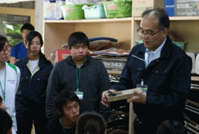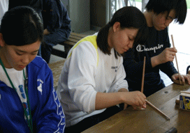 | 参加者に間伐材利用の大切さを知っていただくために、福岡教育大学教育学部教授の大内毅氏から間伐材を使った箸作りを教えていただきました。まず実習の前に、大内氏に県内の森林環境の現状、間伐材利用の意義や利用方法等について説明をしていただきました。その後参加者は、班に分かれて間伐材の木目の方向や節に注意しながらかんなで木を削り、箸を作りました。各班には、福岡教育大学の学生スタッフが入って、参加者のサポートをしてくれました。間伐材を使い、箸を作る実習を通して、参加者は間伐材利用の大切さや間伐材のよさについて学びました。 |