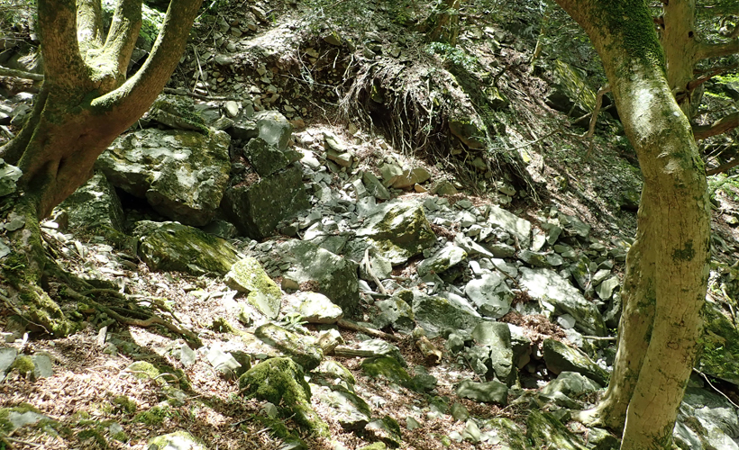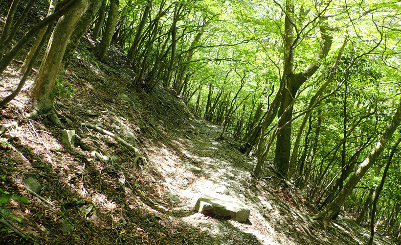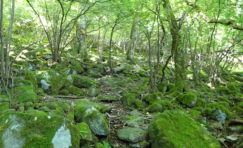 山に入ると、しばらくは岩が多い急傾斜の坂道が続きます。苔が光に照らされると、とてもきれいです。(地図上のcの位置)