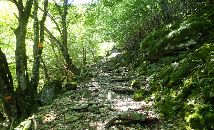 黄色の看板が終わると、木や石の階段が続きます。(歩荷道)(地図上のfの位置)