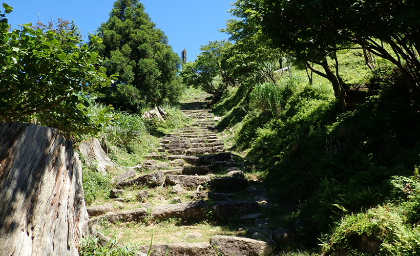 最後の階段です。上宮の三角屋根が見えてきます。(地図上のhの位置)