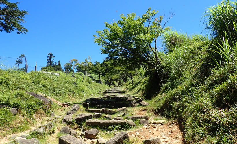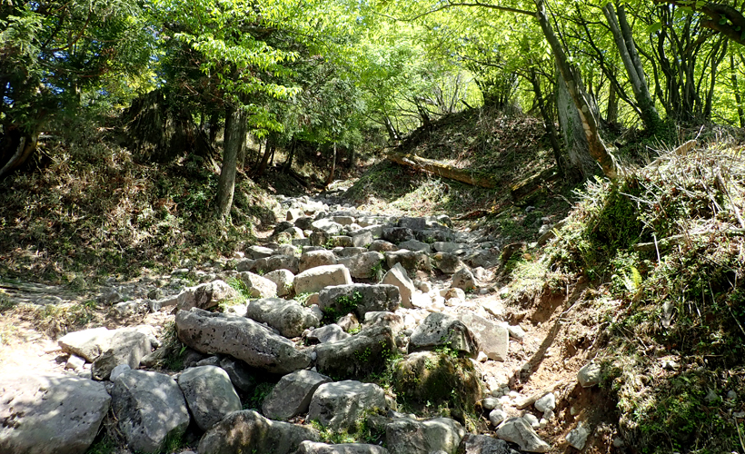 途中から、表参道コースと同じ道になります。段差の大きい石階段が続きます。(地図上のgの位置)