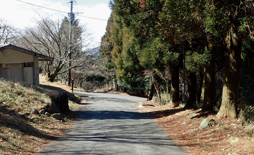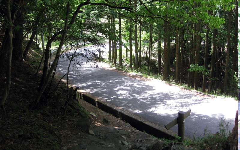 車道に出たら、車道に沿って左に向かいます(ここで九州自然歩道から外れます。車道より下の階段には行きません。)(地図上のcの位置)