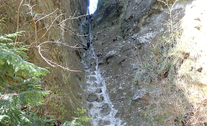崖の上は人ひとりがぎりぎり歩けます。道の下は断崖です。十分気を付けてください。