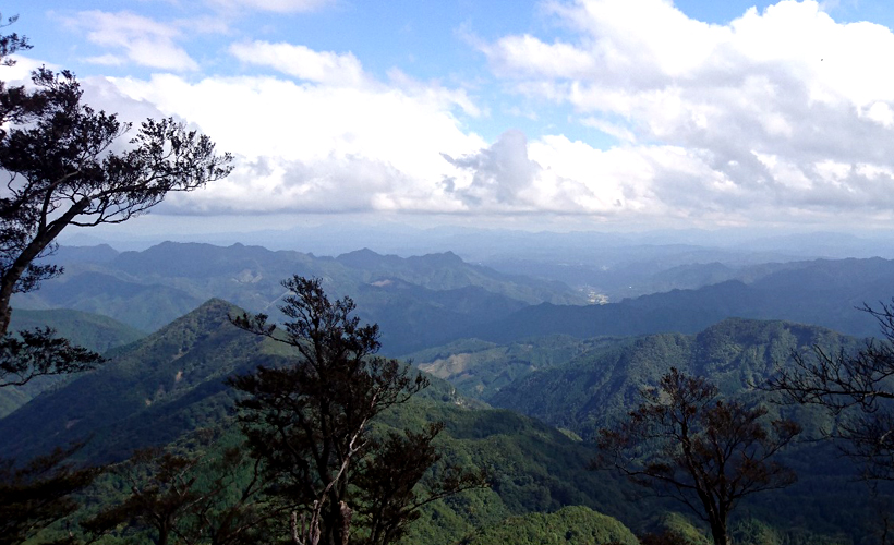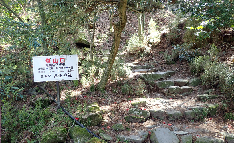 青年の家から九州自然歩道を歩くと高住神社があり、その奥に北岳コースの入口があります。美しい緑色の木々や苔が続く中を歩き、シオジ林やブナ林も楽しめます。コースの始めからわりと急な斜面になっていて、石階段が続くので、大変登りごたえのある登山道です。途中の鎖場や橋のある所は危険ですので注意して渡ってください。北岳の山頂付近から、美しい風景を楽しむことができます。