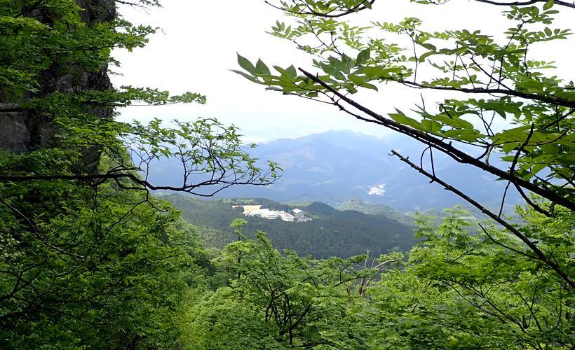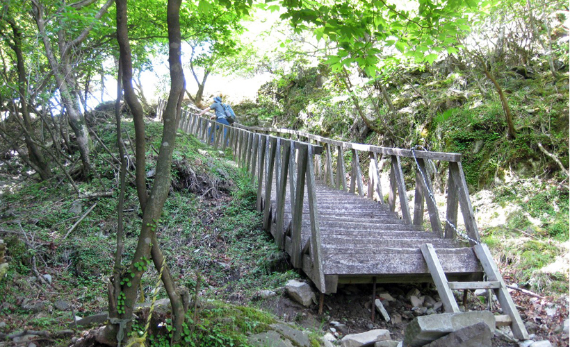 木の階段の手前から青年の家が見下ろせます。かなりの高さを登ったことが分かります。(地図上のcの位置)