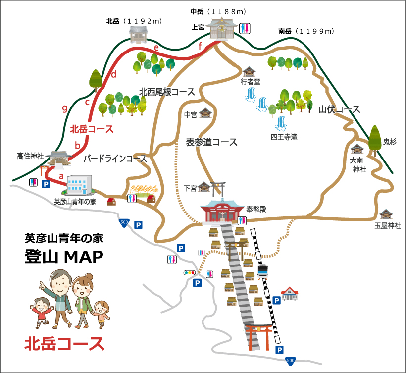 青年の家→高住神社→北岳→中岳(上宮)→北岳→高住神社→青年の家 |