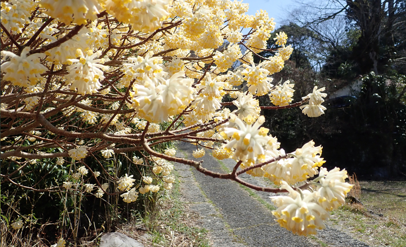 九州自然歩道を外れ、三日月池を過ぎます。季節によってはミツマタを見ることができます。(見頃は三月下旬から四月上旬です。)(地図上のbの位置)
