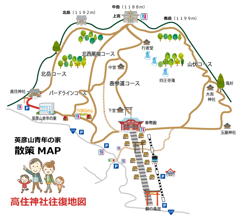 青年の家と高住神社を往復するコースです。九州自然歩道を歩きながら英彦山の澄んだ空気を味わうことができます。高住神社には神牛が祭られており、なでると自分の体の同じところが良くなると言われています。高住神社は特に秋の紅葉が有名で、大勢の人が訪れています。