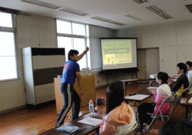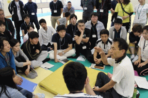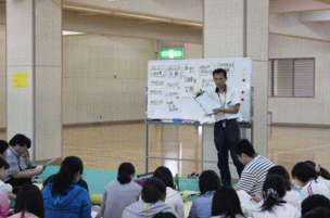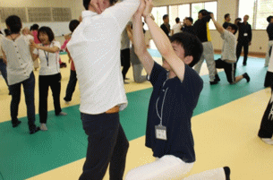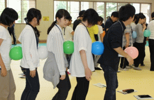 | 2人から大勢で体験するレクリエーションを中心に、リーダーシップのとり方など、その中に含まれている大切な要素を教えていただいた。風船を使ったゲームでは、参加者はどこにリーダーがいて声をかけると誰も風船を落とさずに進めるかなど、話し合って考えながら、集団のリードの仕方について学んだ。 |