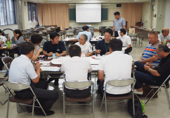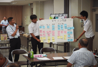 | 各自治体に分かれて、「スポーツを通じた地域活性化に向けて」地域の特色や資源を活かした新たな事業を創造させた。テーマについては、「スポーツ合宿」「マラソン大会」「ウオーキング、トレッキング」から1つ設定させ、テーマに沿って、自分のまちの強みや課題をもとにアイデアや課題解決の方策を交流させた。まとめの活動では、グループごとに考えた事業を発表させ、全体交流を行った後、講師の先生から、考えた事業がもっと良いものになるように、アドバイスをいただいた。 |