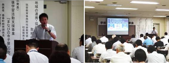 | 香春町の「まなびの寺子屋」について、その歴史や教育委員会と学習支援リーダー(コーディネーター)、ボランティア(支援員)の役割や地域の人材活用の効果等について実践発表がありました。子ども同士をつなぎつつ、学校を中心に地域づくり人材づくりにつながる取組のひとつである「まなびの寺子屋」の良さが伝わり、学校・家庭・地域連携推進啓発を図ることができる内容でした。 |