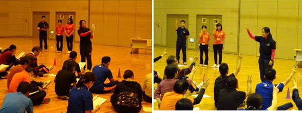 研修は、まずアイスブレーキングから始まりました。参加者の緊張もほぐれたところで、二人一組でタオルを使ってボールおくりをしました。次に、シッティングバレーの動きの確認を行いました。参加者は地面におしりを付けて、前後左右に動く練習を行いました。動きの確認が終わった後は、チームごとに円になって座ったままでパス回しの練習を行いました。そして、2つのパートに分かれ、ゲームを行いました。