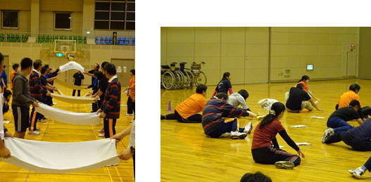 | タオルを使ってボールおくりをする参加者の様子 |