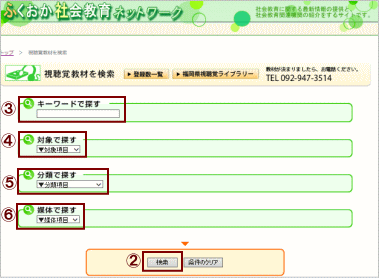 | ① 作品をさがすをクリックする → 下図のような画面が出る (福岡県立社会教育総合センターサイトへリンクします) | ||||||||||||||||