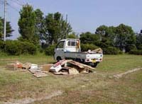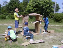 | 自由遊びの中にダンボールや木切れでの工作を取り入れようと、材料であるダンボールを頴田病院、大型電気店、スーパー、ディスカウントショップなどを回って大量に集めました。 木切れはピザ釜のたき木と共に、子ども会の会長が手配。道具のかなづち、のこぎり、くぎ、ハサミ、ガムテープなどは公民館にあるものを使うことにしました。 | ||