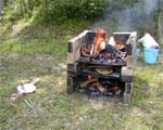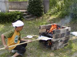 | ピザ釜に必要なのはレンガと鉄板、ピザを出し入れする長い取っ手のついたヘラ。これらの道具は、他地区の子ども会(稲築・筑穂)から子ども会会長を通じて借用しました。 | ||