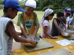 | まずは全員で、お昼に食べるピザ作りにとりかかります。材料を量り、ボウルに入れてまぜていくと、ベタベタの生地がだんだんまとまってきます。それをよくこねて、なめらかになったところでラップをかけて発酵させます。そのときに自分のものと分かるよう、それぞれが葉っぱなどで目印をつけておきました。 インリーダーの子どもたちはピザ釜作りとまき割りの作業です。さすがに一度体験しているだけあり、英彦山での講習会で習ったことを思い出しながら慣れた手つきでまきを割っています。その姿が少し頼もしく感じられました。 生地が発酵するのを待つ間に、斜面にはブルーシートが張られていました。ロープを通した両端を木にくくりつけ、間をペグで打ち付けてシートを固定します。滑り降りたところにちょうど溝があり、危険が予測されたため、その溝にダンボールを詰め、上に板を置き、その上にブルーシートをかぶせる工夫をしました。 そして、ホースで上から水を流します。最初は「水は流さんでいい。」「汚れる。」と言いながらダンボールの上に乗って滑っていた子ども達が、プレイリーダーの声かけ(「いっしょに滑ろうよ!」)で1人、また1人と洋服のまま水の流れる斜面を滑り出しました。一度覚悟を決めて滑ってしまえば、2回目からはどんなに濡れても汚れても平気のへっちゃら!どんどん子ども達が集まってきて、次から次へ滑り出しました。途中下にたまった水をモップで拭いたり、ホースを持ってみんなに水をかける役割を自分から買って出る子も現れ、大きな歓声が上がりました。水しぶきと一緒に子ども達の笑顔も太陽にキラキラ輝いていました。 遊んでいる間にピザ生地が発酵したので、各自好きな食材をトッピングして、オリジナルピザを作りました。それを手作りのピザ釜に入れて焼きます。次々に焼きあがるピザを子どもたちはさっそく自分で作ったダンボールの家に持ち込んで、美味しそうに食べていました。 |