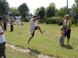 | 食事のあいだもスライダー遊びは何度も何度もあきることなく続きます。大きい子達が楽しそうに遊ぶのを見ながら、小さい子や女の子たちは、「やりたいけど入れない・・でもやってみたい・・」とうらやましそうな表情。そんな時、プレーリーダーの古賀さんがさりげなく輪ゴムを持ち出し、つなぎ始めました。長く長くつながっていく輪ゴム。女の子達がそれをまねして作り始めます。一人一人のつなげたゴムを互いにつなぎあわせると長い長いゴムとびができるゴムができあがりました。 それをつかってさっそくゴムとび開始です。最初は低く、だんだん高く。女とび、正面とび、いろんなとび方でクリアしていく子どもたち。どんどん盛り上がってきたところに、スライダーで遊んでいた男の子達もやって来ました。高学年の男の子の飛び方はダイナミック。迫力があります。 そうやって今までスライダーで遊んでいた子がゴムとびに移ったことで、スライダーがしたくても一歩引いていた子ども達にチャンスが回ってきました。めでたくスライダーにたどりついた小さな子ども達も、びしょぬれになりながら心ゆくまでスライダーを楽しんでいました。 思い切り遊んだあとは、子どもたちや保護者の方々と一緒に片付けをして、プレーパークは終了しました。すり傷程度のケガはありましたが、大きな事故もなく、スタッフはホッとしました。遊びに夢中になっている子ども達の輝く笑顔を見ることができ、大人も元気をもらった1日でした。 |