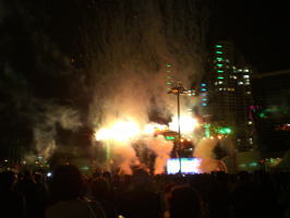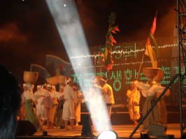 午後7時から、先ほどの特設ステージで、全国平生教育フェスティバル開会式が行われました。開会式は、光と音のペーゼントに加え、色とりどりの花火が打ち上げられる迫力ある開会式でした。挨拶には韓国の文科省の大臣(?)挨拶や釜山市長の挨拶の後、韓国で有名なミュージシャンが2名登場し華やかな開会式に色を添えていいました。 開会式の始まる1時間くらい前から、特設ステージ前の野外いす(2000人位かな?)は満席になり、周りにも多くの人垣ができ大歓声の中で開会式が始まりました。韓国の平生教育のこれからの盛り上がりを感じさせられました。 |