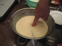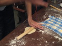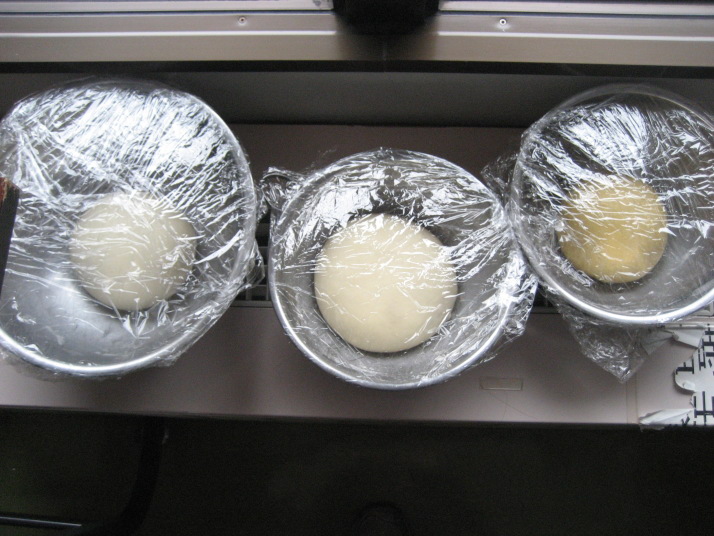 ●レストランでは小麦粉など分量を計り生地づくり ●メモをとる指導員たち ●発酵中! |