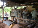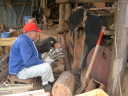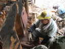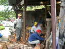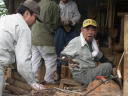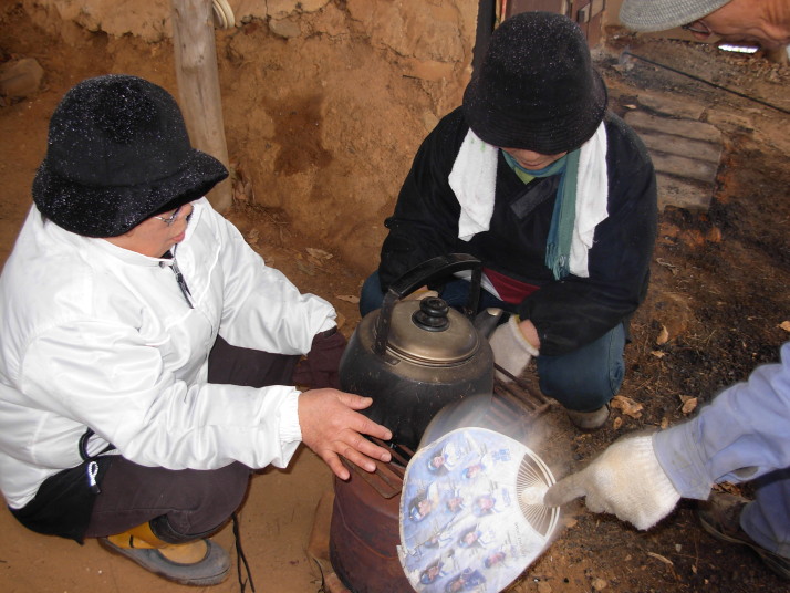 | ●石窯では、田中さん、浦屋さん、荒谷さんが火を入れパンが焼けるように準備をします。 ●暖をとりながら |