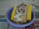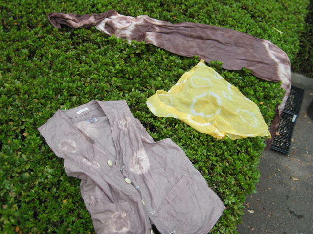 アカメガシワが灰紫色、ビワがピンク、タマネギが黄色に染まりました。 |