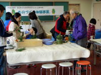 「若杉の会」メンバーの奥藤さん、佐田さん、西さんが、講師として説明・指導を行い、参加者のミニ門松作りのお手伝いをしました。自然のものを使った自分だけのオリジナルのミニ門松を作ることができて参加者のみなさんは喜んでいました。 |