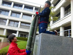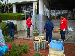 平成26年12月3日(水)に社会教育総合センター恒例の「大門松」作りました。センター正面玄関と少年自然の家玄関前に設置し、センターを利用していただく皆様の無病息災と新年への願望を込めて作成し、新年を迎える準備が無事にできました。 |